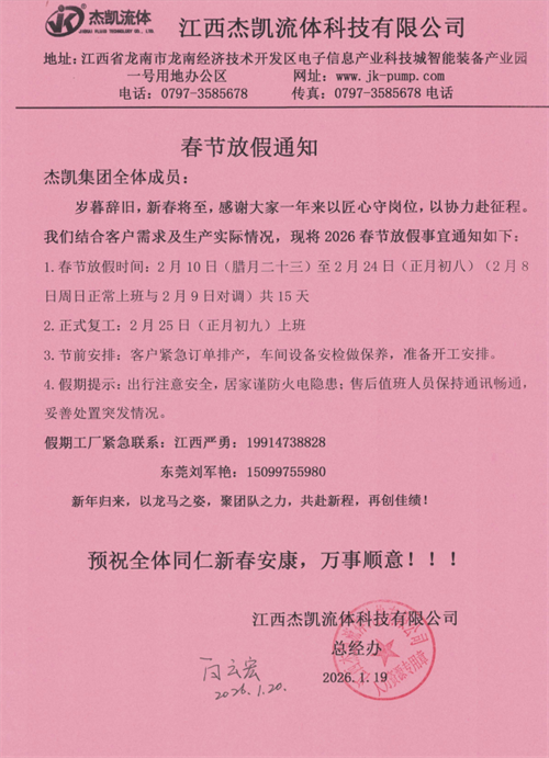 杰凱流體|2026年春節放假通知!